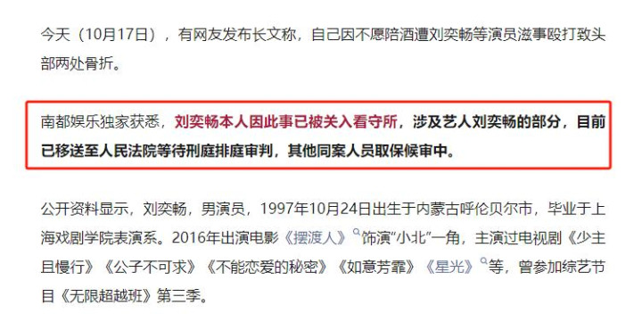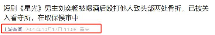 上游新闻|短剧《星光》男主刘奕畅被曝酒后殴打他人致头部两处骨折,已被关入看守所,在取保候审中.2025