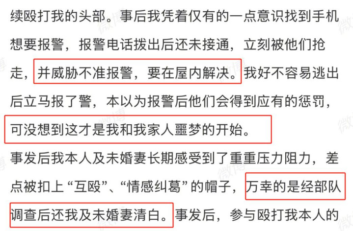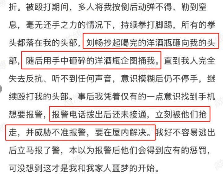 事后他挣扎着摸到手机想报警,电话刚拨出去还没接通,就被刘奕畅等人抢走,还威胁他“不准报警,这事就在屋里解决”。