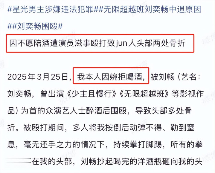 一位网友控诉,自己因为拒绝陪酒,被演员刘奕畅等人酒后围殴,导致头部骨折。